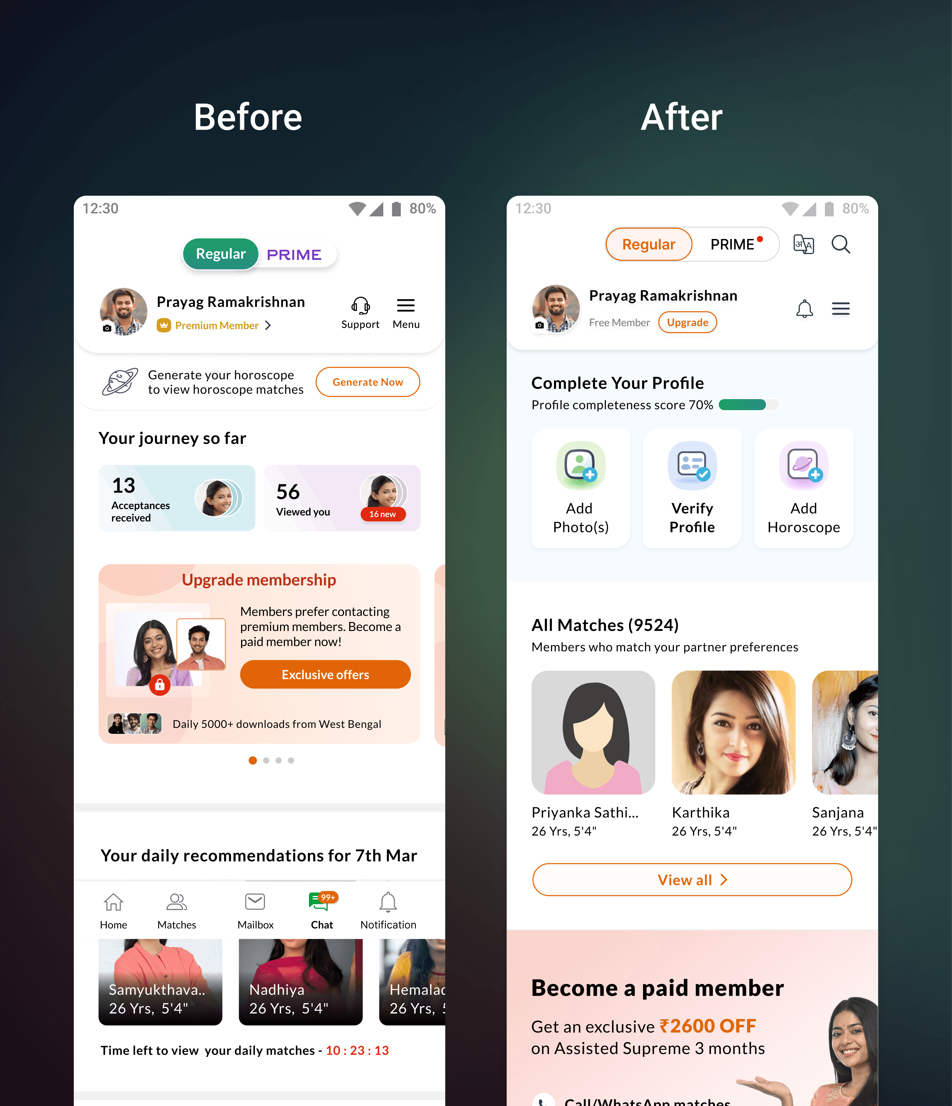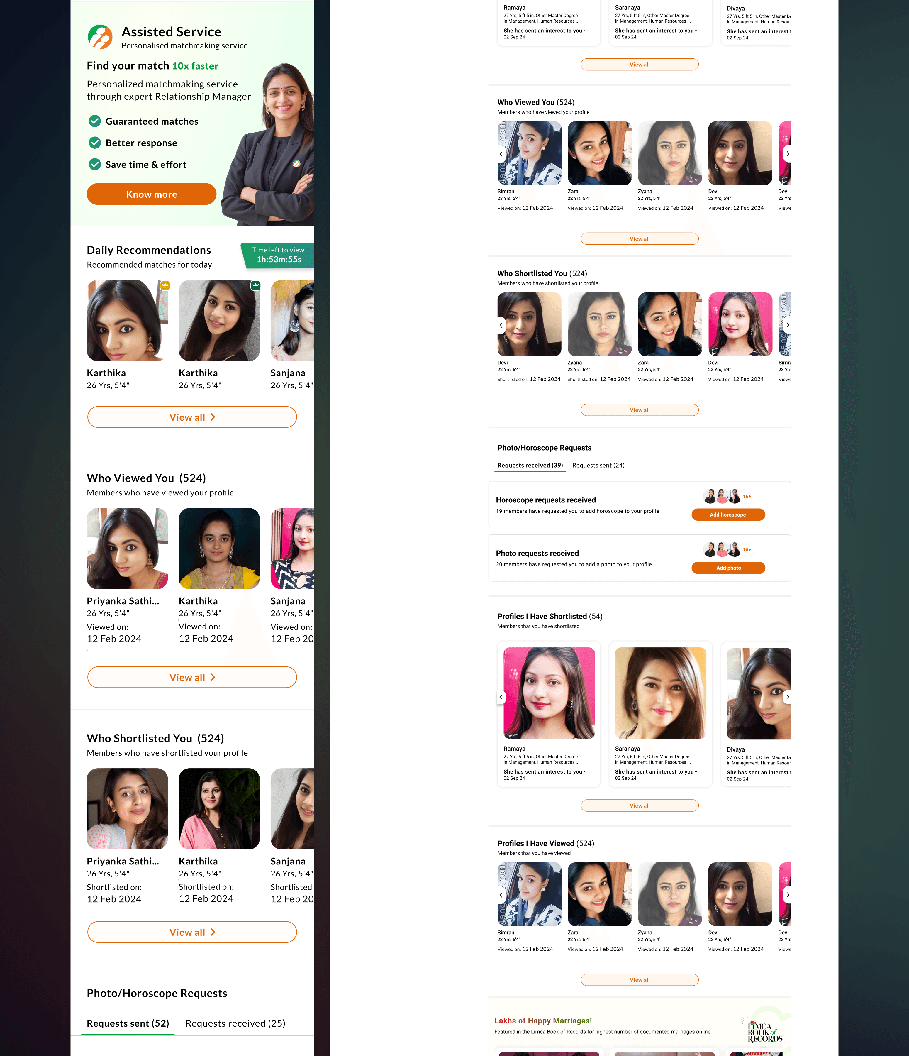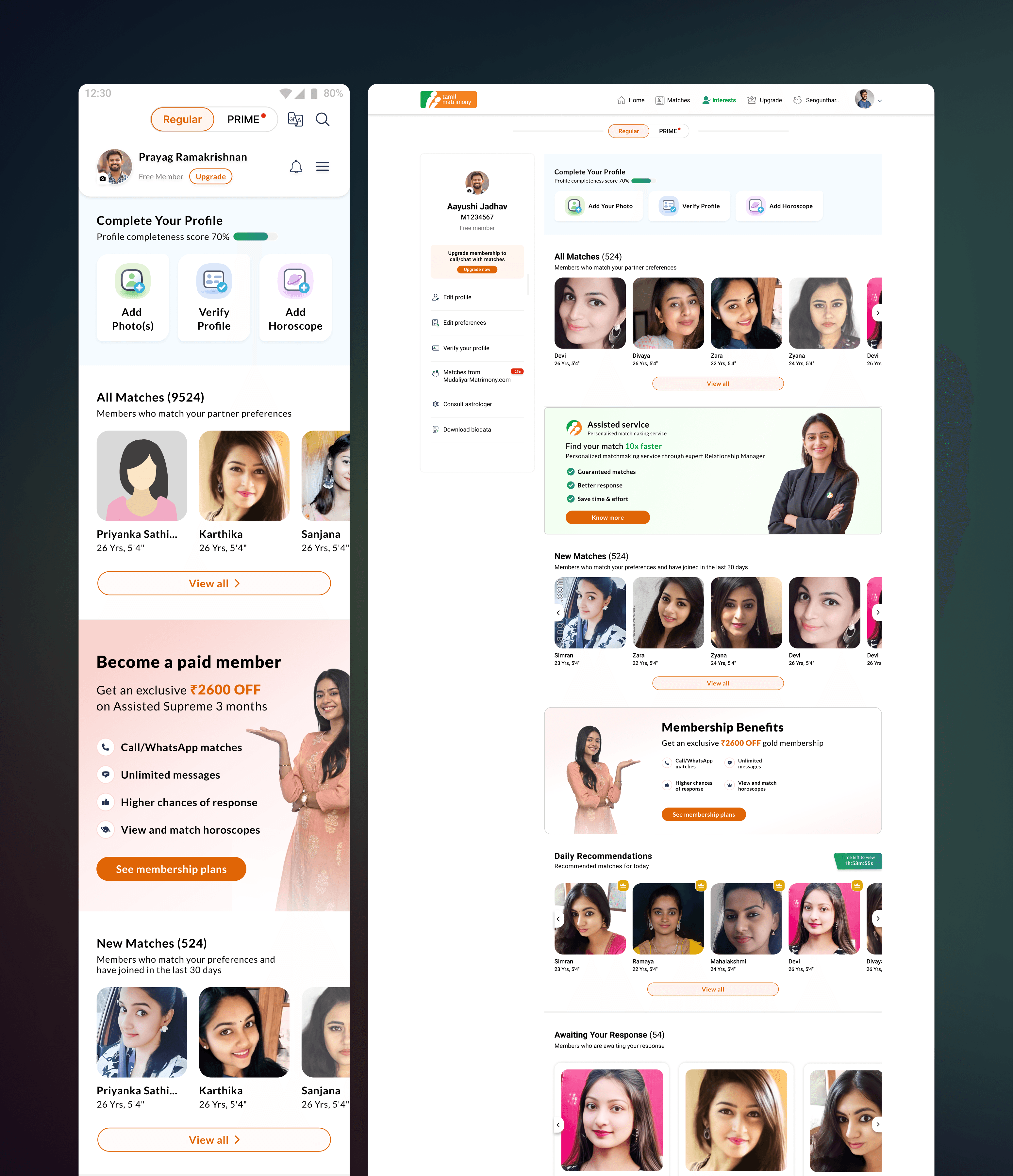 Boosted profile completion with clearer CTAs, increased member engagement through improved match visibility, and enhanced dashboard usability across devices with readiness for future personalization.