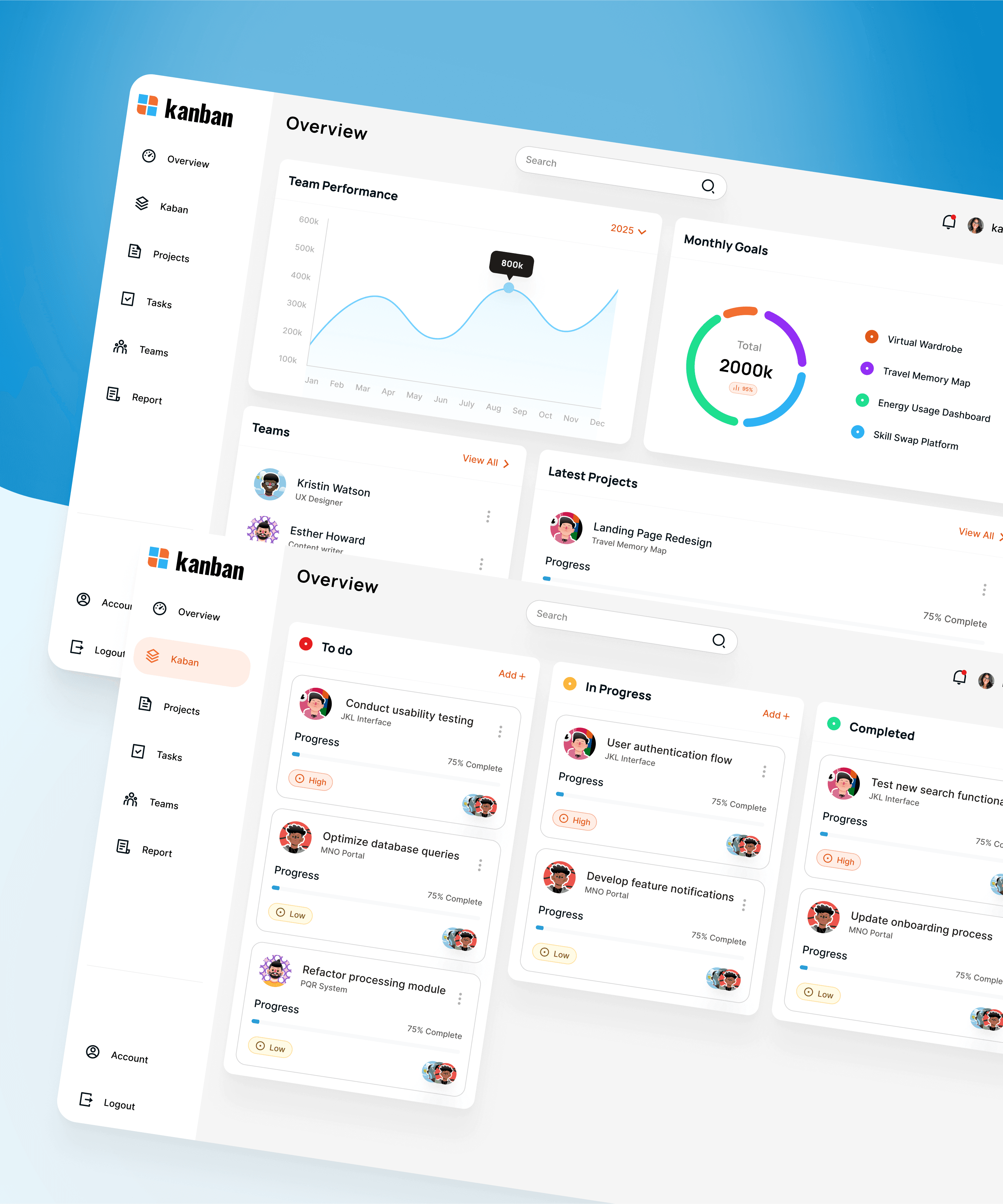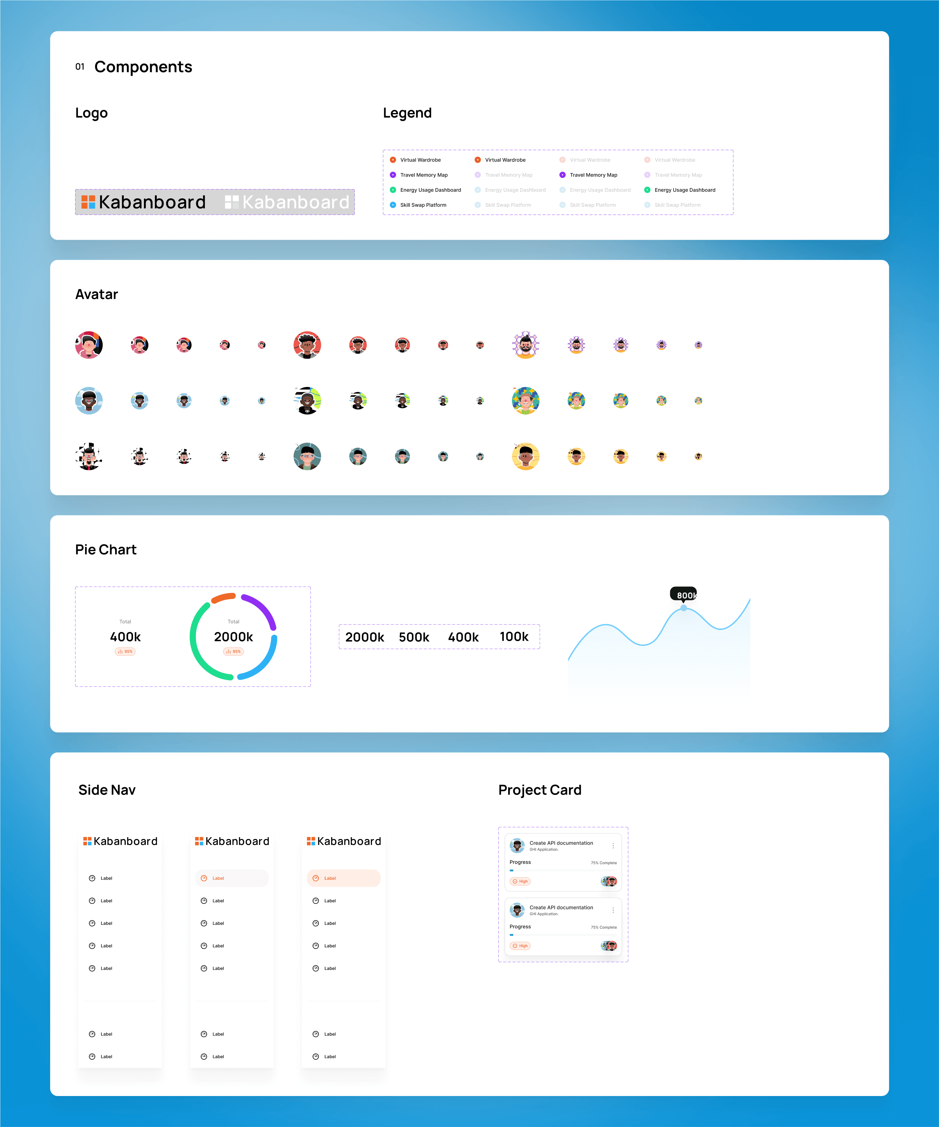 Reusable components: Modular nav, cards, avatars, charts, and sidebars for rapid assembly.