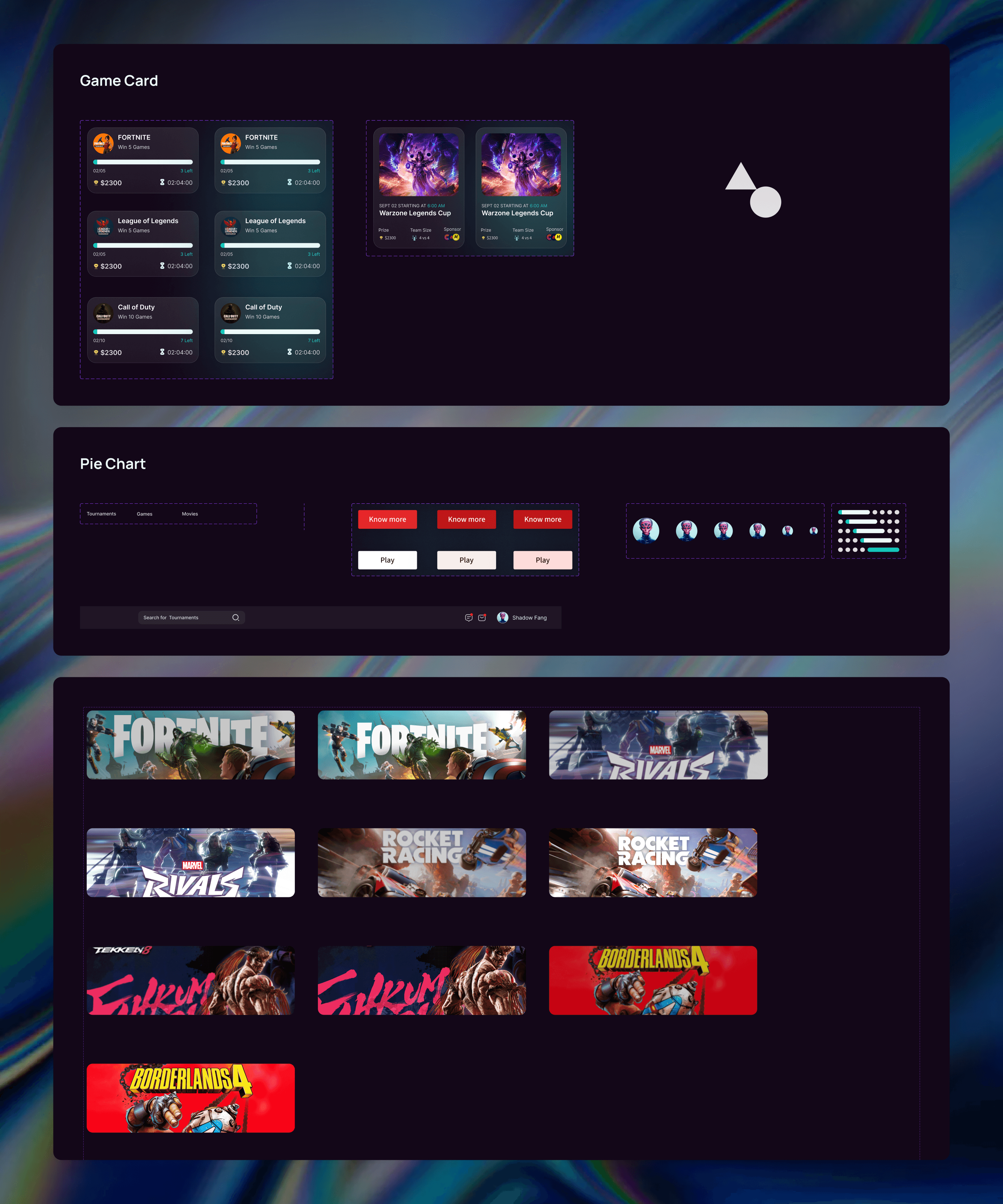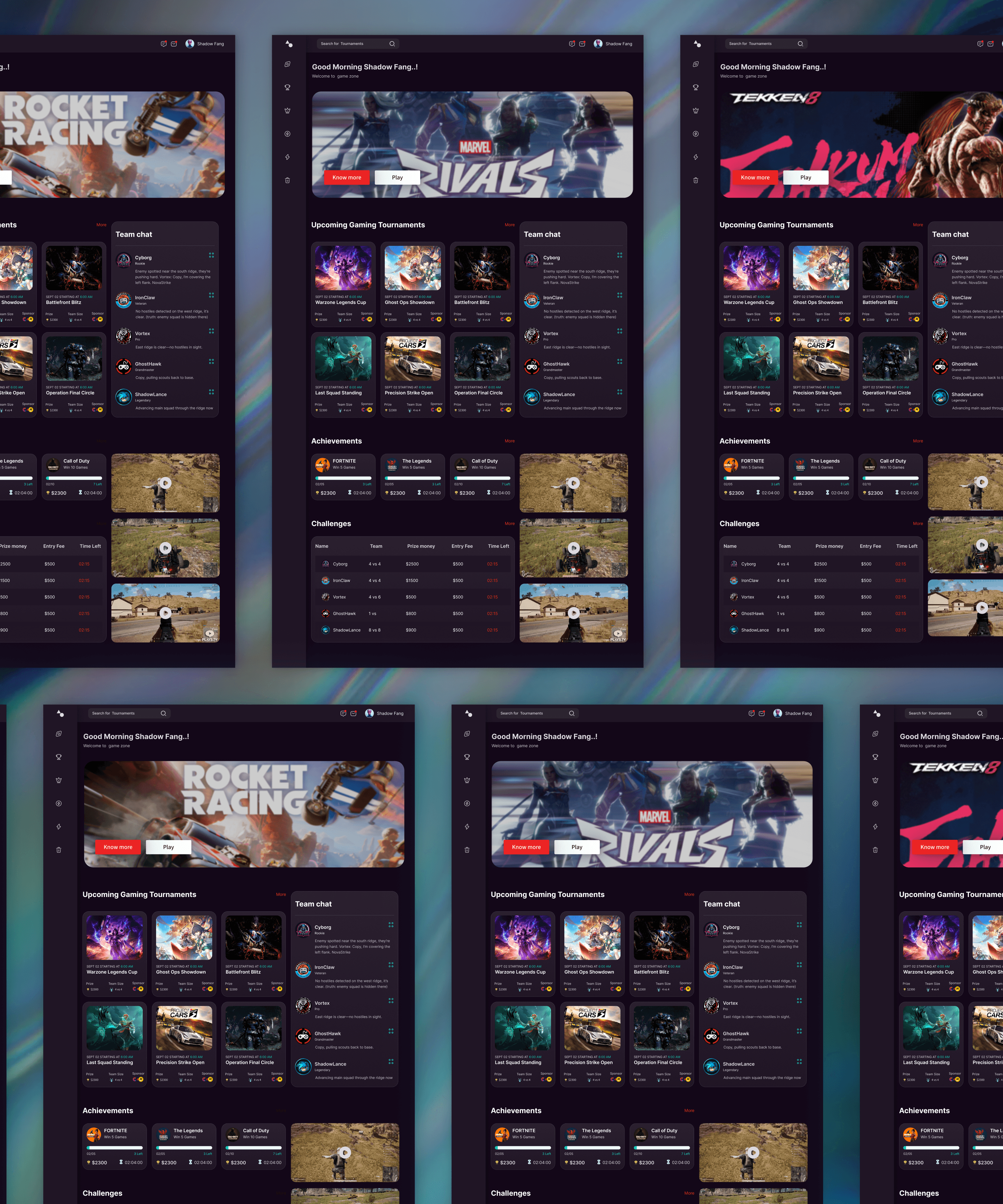 Created modular components—game cards, tournament grids, chat panels, achievement badges, and leaderboards.